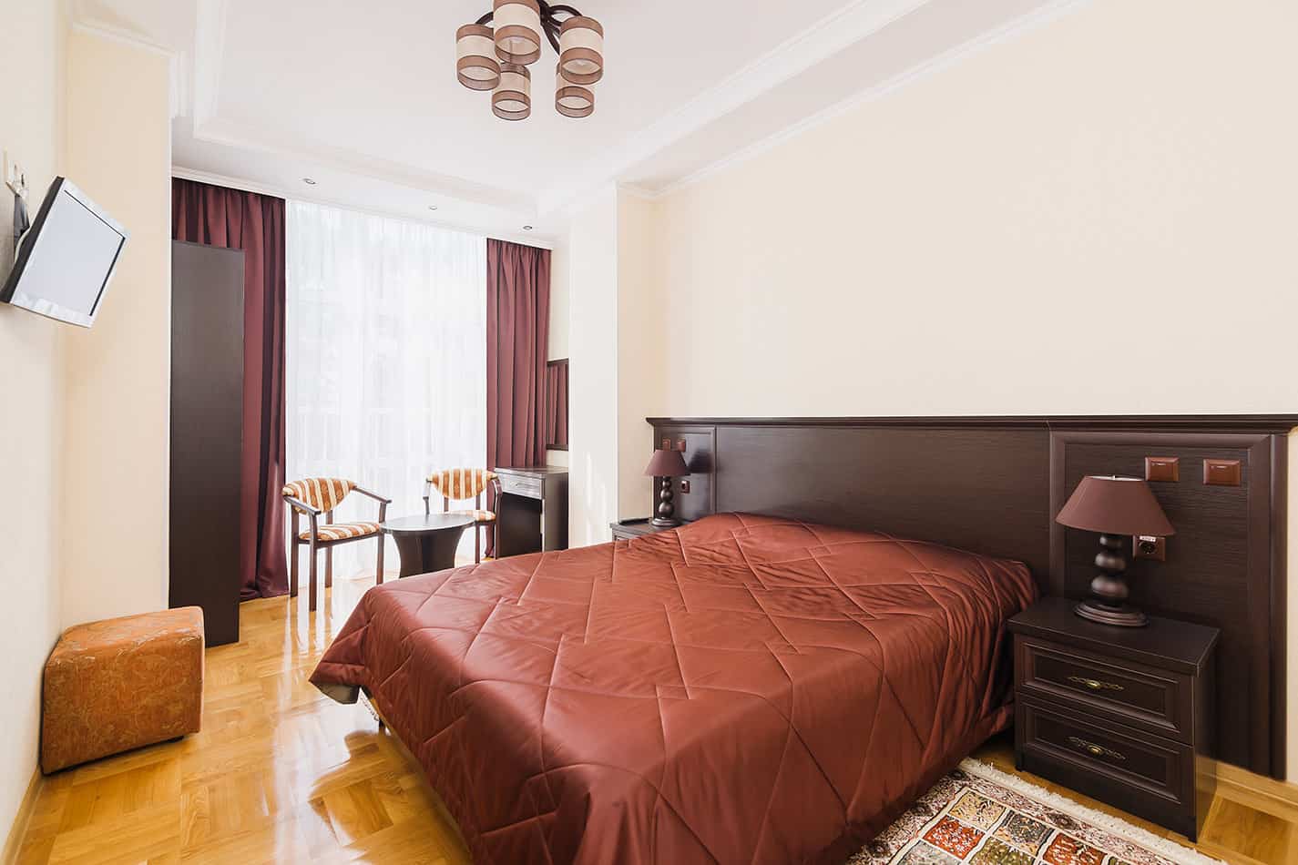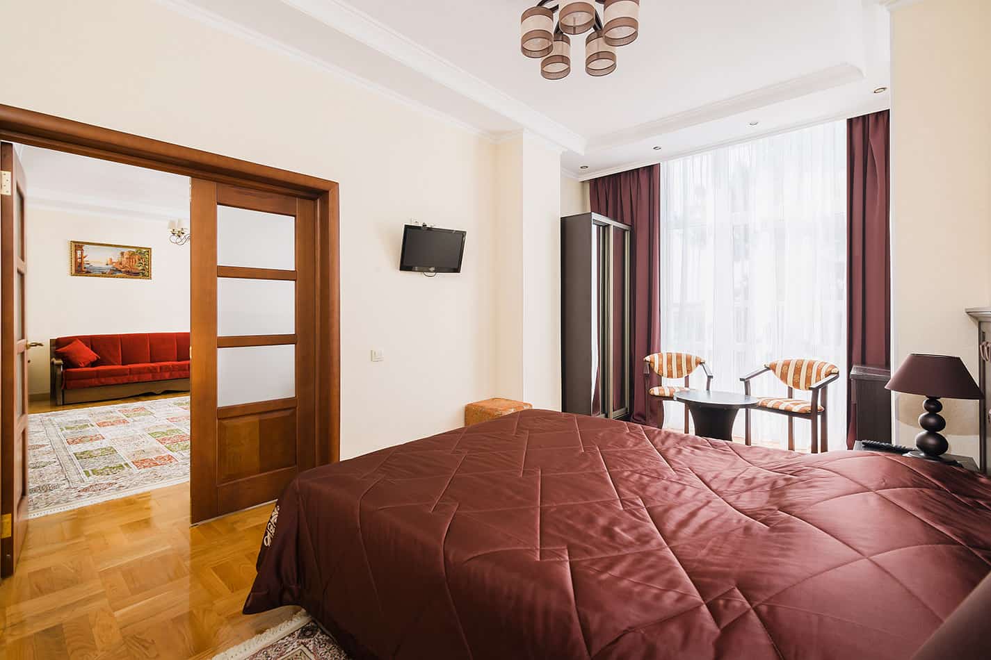 Люкс для тех, кто выбирает отдых на высоком уровне. Площадь номера составляет 50 кв.м, имеются две комнаты (спальня и гостиная).