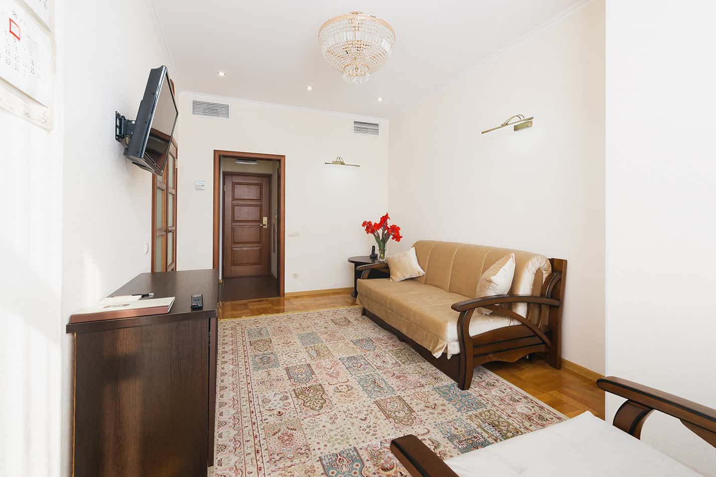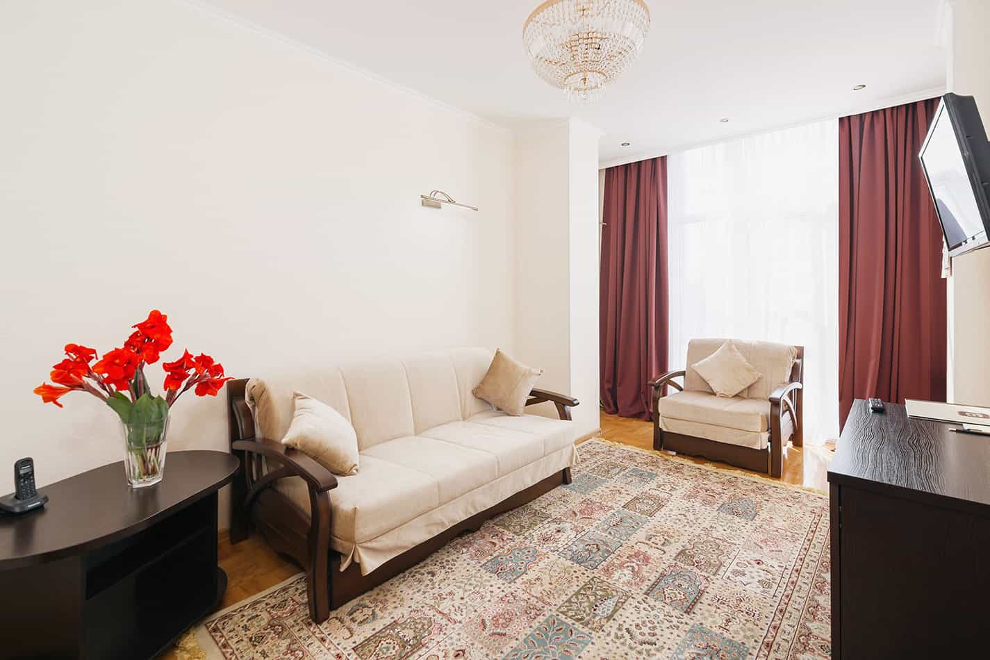 Номера площадью 35 кв.м состоят из двух комнат: спальни и гостиной. Полулюкс станет отличным выбором для проживания семьи.