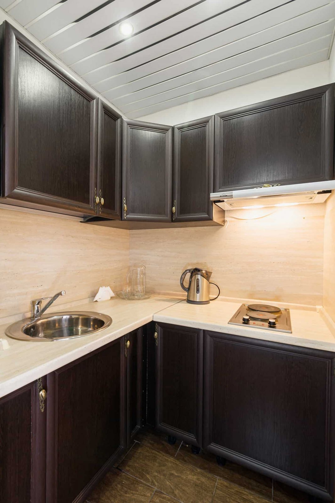 Здесь имеются двуспальная кровать, прикроватные тумбочки, телевизор, диван. В гостиной есть кухонная зона, где расположены электрочайник, электроплита, мини-холодильник. Гостям предоставляется набор посуды.